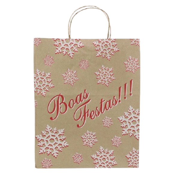 SACOLA PAPEL KRAFT NATURAL BOAS FESTAS 27X20X33 C/10